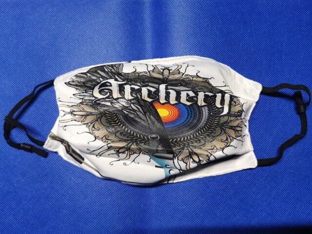 ポリエステル製アーチェリーデザインのマスクです。洗濯可能ですので洗って繰り返し使用できます。両サイドのゴムバンドはサイズ調節が可能です。内側にはフィルターが追加できるよう内ポケットの付いた二重構造となっていて、鼻の当たる部分はワイヤー入りです。